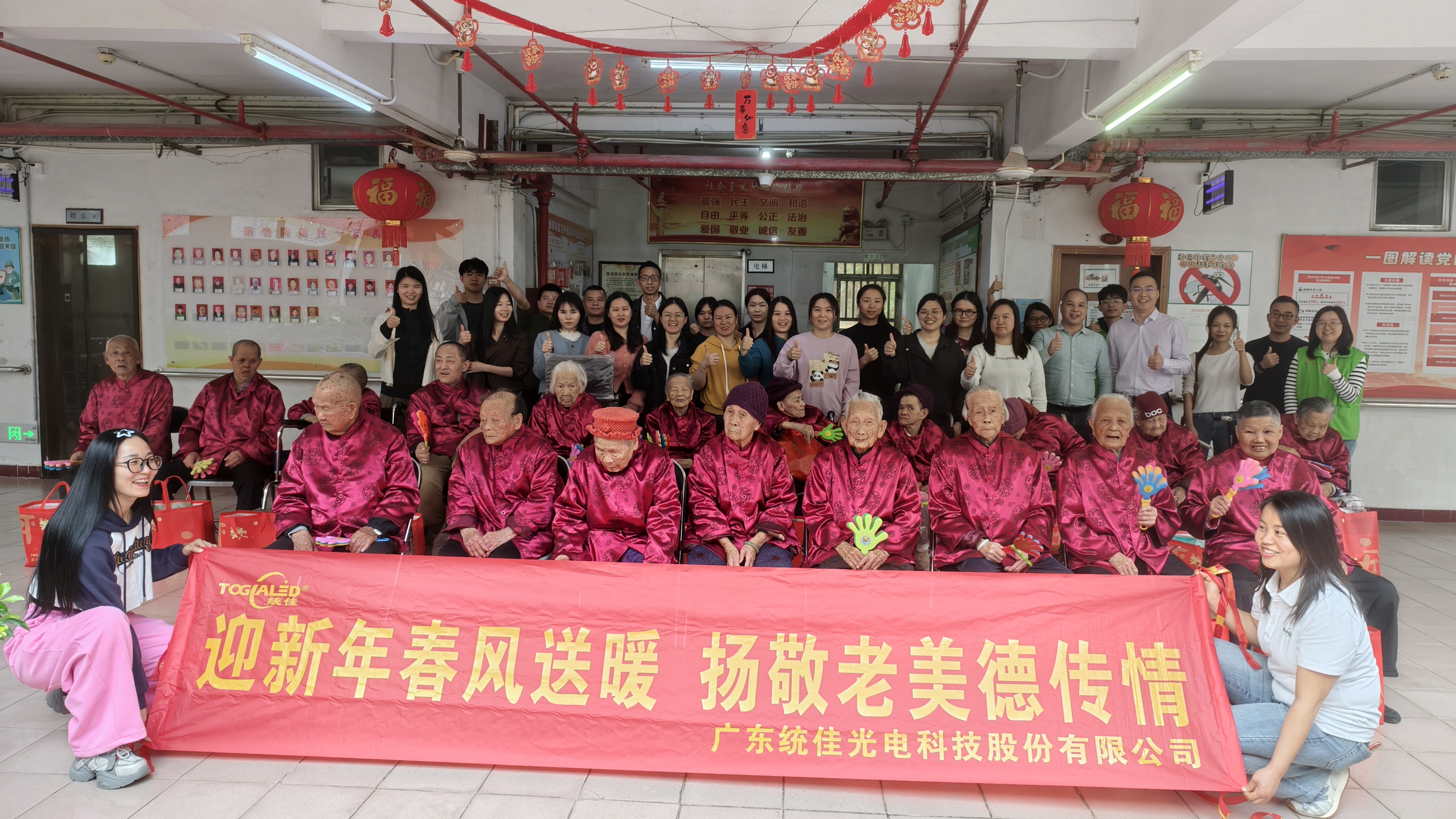 为积极践行企业社会责任,传承中华民族尊老敬老的传统美德,2026年2月6日,广东统佳光电科技股份有限公司组织员工志愿者代表,前往本地福利院开展“情暖桑榆”新春慰问活动,为老人们送去诚挚的问候与节日祝福,以实际行动传递统佳人的温暖与关怀。